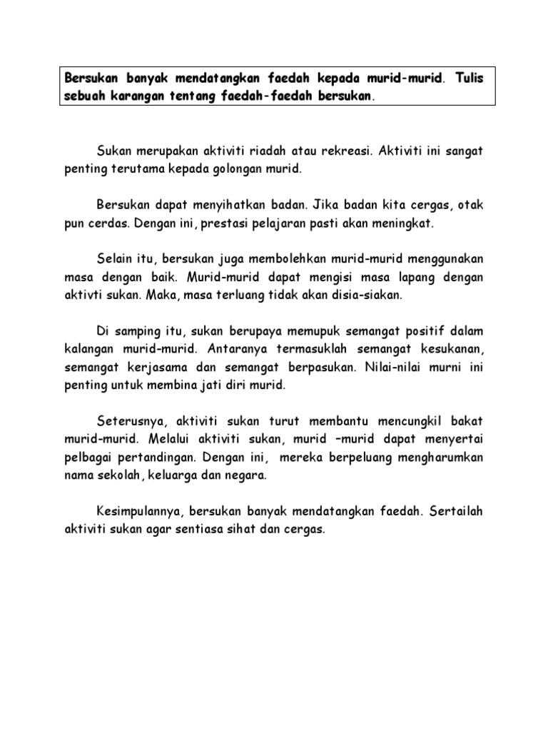 CONTOH KARANGAN TERBAIK FAEDAH BERSUKAN Sukan bukanlah semata-mata aktiviti fizikal yang dilakukan untuk mengisi masa lapang atau sebagai riadah kecil mengeluarkan. Sesungguhnya sukan berfaedah kepada individu masyarakat dan negara. Kenyataan ini jelas sekali menunjukkan bahawa sukan rekreasi juga bermatlamatkan untuk meningkatkan tahap kecergasan bagi melahirkan pelajar yang aktif kreatif dan inovatif.